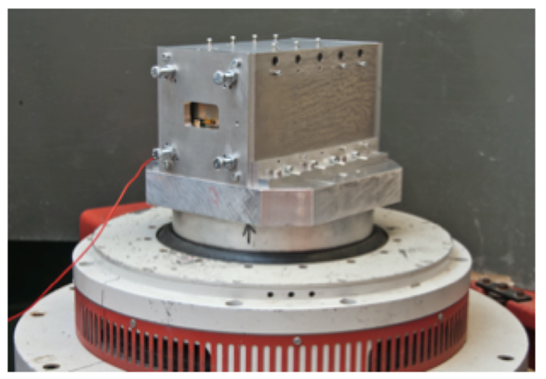A sine-burst test was used to apply a quasi-static load to the CubeSat inside the test-POD in order to strength qualify the item and its design for flight. The sine-burst test is a simple method to apply a quasi-static load using a vibration shaker and shock testing software. This is used in lieu of acceleration (centrifuge) or static tests.The applied loads are at 10.8g for each axis.