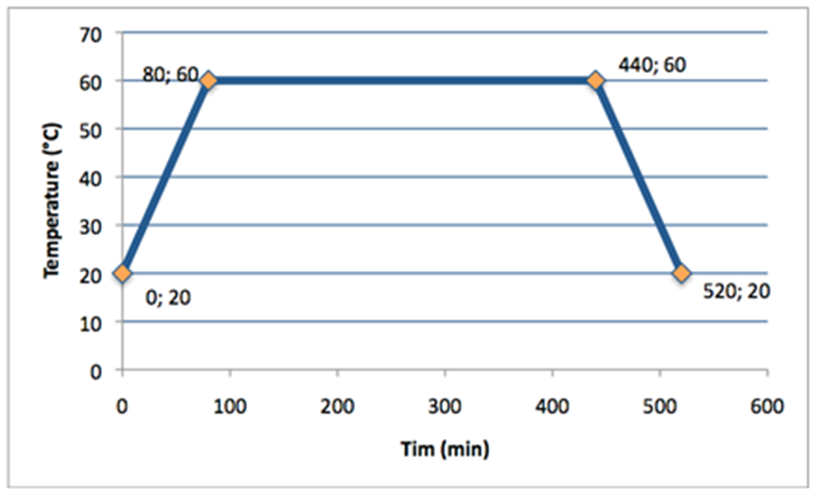 The total duration of the bake-out test was 4.5 hours. Out of this period, the temperature was kept at 50oC from minute 80 to minute 260, or for a total duration of 180 minutes or 3 hours after thermal stabilization. Pressure was maintained at 10-5 mbar for the entire duration of the test.